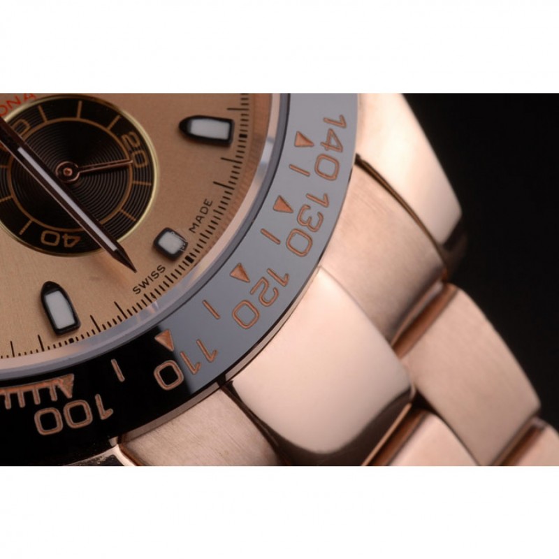 El diseño del reloj destaca por su bisel de cerámica negra con un tachímetro, lo que lo hace perfecto para los amantes del automovilismo y la precisión. El cristal de zafiro protege el dial de color dorado, que también brilla en la oscuridad, ofreciendo una visibilidad óptima en todo momento. La corona está elegantemente diseñada, con un embellecimiento de oro rosa y el logo de Rolex, mientras que la pulsera de acero inoxidable también chapada en oro rosa cuenta con un cierre desplegable con el logo de la marca.